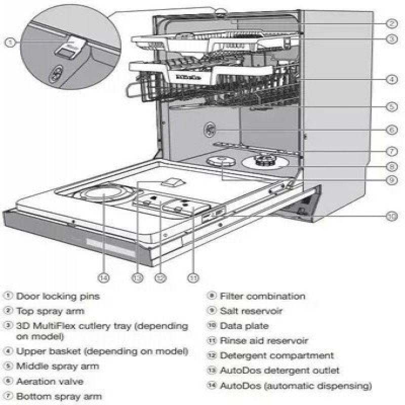 Встраиваемая модель Miele G7970 SCVi AutoDos K2O -отлично впишется в любой интерьер, главное — правильно выбрать место, чтобы подвести коммуникации. Устанавливается в нишу целиком, полностью закрывается декоративной панелью. Имеет стандартные размеры, поэтому может не поместиться на очень маленькой кухне. В камеру можно загрузить ограниченное число комплектов: 14 шт. Комплектом считается набор посуды на одного человека, который нужен для полноценного приема пищи: глубокая и плоская тарелки, тарелка для салата, блюдце под чашку, сама чашка, ложка и вилка.Эту модель можно подключить напрямую к горячей воде, чтобы сэкономить энергию на нагрев холодной. Она надежно защищена от протечек — если по какой-то причине не будет работать слив, клапан заблокирует шланг, чтобы больше внутрь вода не поступала. По окончании работы она подаст специальный сигнал.